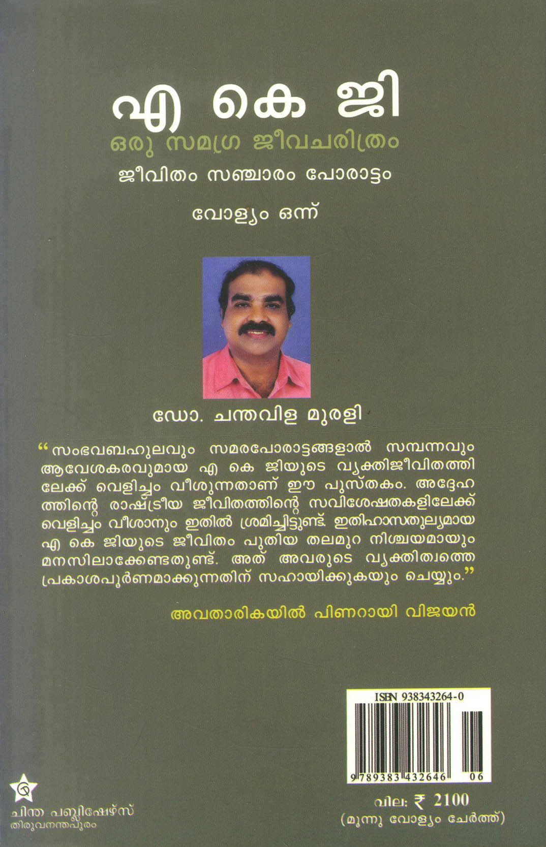 ‘സംഭവബഹുലവും സമരപോരാട്ടങ്ങളാൽ സമ്പന്നവും ആവേശകരവുമായ എ കെ ജിയുടെ വ്യക്തിജീവിതത്തിലേക്ക് വെളിച്ചം വീശുന്നതാണ് ഈ പുസ്തകം. അദ്ദേഹത്തിന്റെ രാഷ്ട്രീയ ജീവിതത്തിന്റെ സവിശേഷതകളിലേക്ക് വെളിച്ചം വീശാനും ഇതിൽ ശ്രമിച്ചിട്ടുണ്ട്. ഇതിഹാസതുല്യമായ എ കെ ജിയുടെ ജീവിതം പുതിയ തലമുറ നിശ്ചയമായും മനസിലാക്കേണ്ടതുണ്ട്. അത് അവരുടെ വ്യക്തിത്വത്ത പ്രകാശപൂർണമാക്കുന്നതിന് സഹായിക്കുകയും ചെയ്യും.’