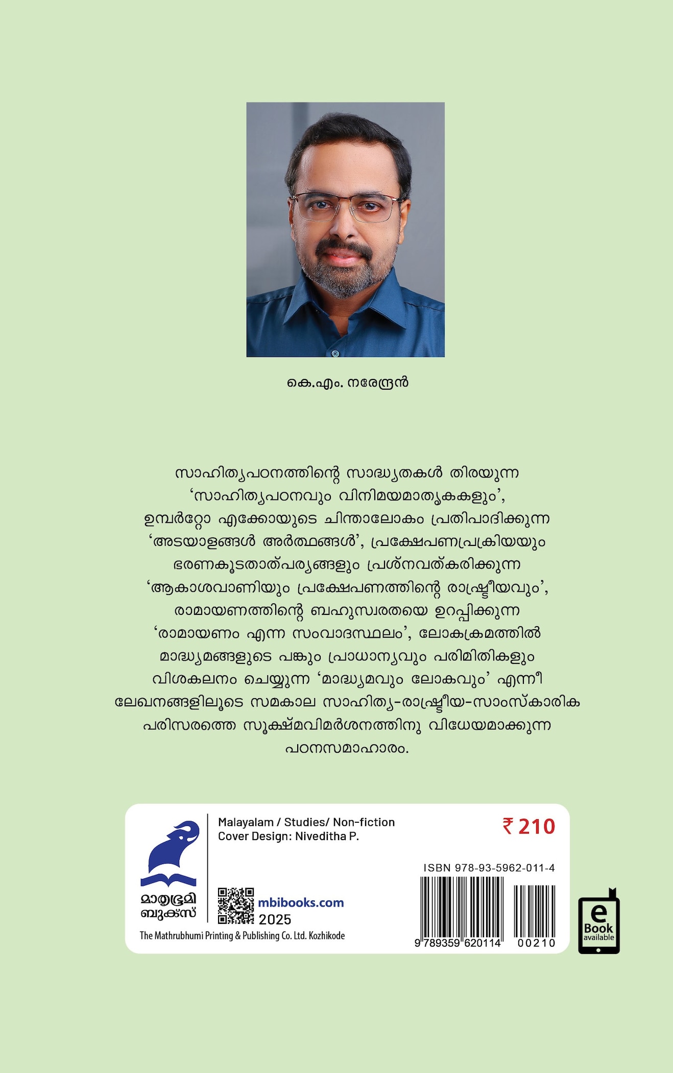 ‘അടയാളങ്ങള് അര്ത്ഥങ്ങള്’, പ്രക്ഷേപണപ്രക്രിയയും ഭരണകൂടതാത്പര്യങ്ങളും പ്രശ്നവത്കരിക്കുന്ന ‘ആകാശവാണിയും പ്രക്ഷേപണത്തിന്റെ രാഷ്ട്രീയവും’, രാമായണത്തിന്റെ ബഹുസ്വരതയെ ഉറപ്പിക്കുന്ന ‘രാമായണം എന്ന സംവാദസ്ഥലം’, ലോകക്രമത്തില് മാദ്ധ്യമങ്ങളുടെ പങ്കും പ്രാധാന്യവും പരിമിതികളും വിശകലനം ചെയ്യുന്ന ‘മാദ്ധ്യമവും ലോകവും’ എന്നീ ലേഖനങ്ങളിലൂടെ സമകാല സാഹിത്യ-രാഷ്ട്രീയ-സാംസ്കാരിക പരിസരത്തെ സൂക്ഷ്മവിമര്ശനത്തിനു വിധേയമാക്കുന്ന പഠനസമാഹാരം.