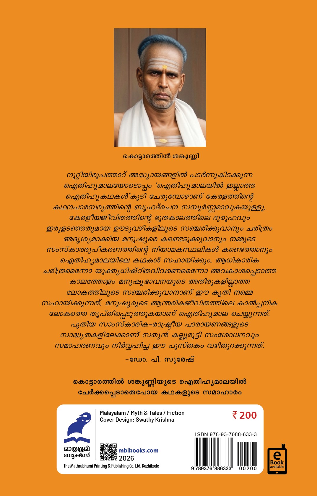 നൂറ്റിയിരുപത്താറ് അദ്ധ്യായങ്ങളില് പടര്ന്നുകിടക്കുന്ന ഐതിഹ്യമാലയോടൊപ്പം ‘ഐതിഹ്യമാലയില് ഇല്ലാത്ത ഐതിഹ്യകഥകള്’കൂടി ചേരുമ്പോഴാണ് കേരളത്തിന്റെ കഥനപാരമ്പര്യത്തിന്റെ ബൃഹദ്രചന സമ്പൂര്ണ്ണമാവുകയുള്ളൂ. കേരളീയജീവിതത്തിന്റെ ഭൂതകാലത്തിലെ ദുരൂഹവും ഇരുളടഞ്ഞതുമായ ഊടുവഴികളിലൂടെ സഞ്ചരിക്കുവാനും ചരിത്രം അദൃശ്യമാക്കിയ മനുഷ്യരെ കണ്ടെടുക്കുവാനും നമ്മുടെ