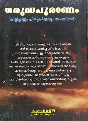 വിവിധ പുരാണങ്ങളുടെ സാരമാകുന്ന രത്‌നങ്ങള്‍ പതിച്ച കിരീടമാണ് ഗരുഡപുരാണം. ഇഹലോകശാന്തിയും പരലോകമാര്‍ഗവും അരുളുന്ന ഈ മഹാപുരാണം നരജന്മദുരിതങ്ങള്‍ അകറ്റുന്ന മഹാഔഷധം കൂടിയാണ്. പണ്ഡിതന്മാര്‍ക്കും പാമരന്മാര്‍ക്കും ഒരുപോലെ പ്രിയപ്പെട്ട, മുഹൂര്‍ത്തം മാസികയില്‍ ഖണ്ഡശ്ശ പ്രസിദ്ധീകരിച്ച ഗരുഡപുരാണത്തില്‍ ലളിതസുന്ദരമായ പുനരാഖ്യാനം.