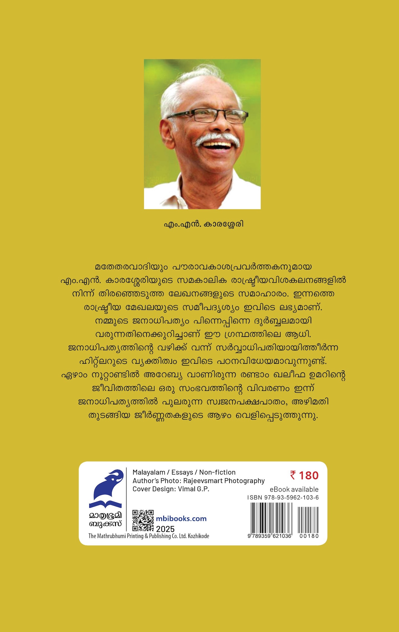 മതേതരവാദിയും പൗരാവകാശപ്രവര്‍ത്തകനുമായ എം.എന്‍. കാരശ്ശേരിയുടെ സമകാലിക രാഷ്ട്രീയവിശകലനങ്ങളില്‍ നിന്ന് തിരഞ്ഞെടുത്ത ലേഖനങ്ങളുടെ സമാഹാരം. ഇന്നത്തെ രാഷ്ട്രീയ മേഖലയുടെ സമീപദൃശ്യം ഇവിടെ ലഭ്യമാണ്. നമ്മുടെ ജനാധിപത്യം പിന്നെപ്പിന്നെ ദുര്‍ബ്ബലമായി വരുന്നതിനെക്കുറിച്ചാണ് ഈ ഗ്രന്ഥത്തിലെ ആധി. ജനാധിപത്യത്തിന്റെ വഴിക്ക് വന്ന് സര്‍വ്വാധിപതിയായിത്തീര്‍ന്ന ഹിറ്റ്‌ലറുടെ വ്യക്തിത്വം ഇവിടെ പഠനവിധേയമാവുന്നുണ്ട്. ഏഴാം നൂറ്റാണ്ടില്‍ അറേബ്യ വാണിരുന്ന രണ്ടാം ഖലീഫ ഉമറിന്റെ ജീവിതത്തിലെ ഒരു സംഭവത്തിന്റെ വിവരണം ഇന്ന് ജനാധിപത്യത്തില്‍ പുലരുന്ന സ്വജനപക്ഷപാതം, അഴിമതി തുടങ്ങിയ ജീര്‍ണ്ണതകളുടെ ആഴം വെളിപ്പെടുത്തുന്നു.