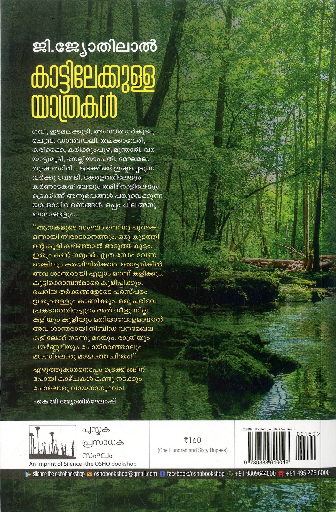 ജ്യോതിലാലിന്റെ കാട്ടിലേക്കുള്ള യാത്രകൾ വായിച്ചാൽ കാട് നമ്മളെത്തിരഞ്ഞു വരുന്ന പ്രതീതിയാണുണ്ടാവുക. സാഹസികതയെ ഓമനിക്കുന്നവർക്കും കാടിനകം കാണാനും പഠിക്കാനും ആഗ്രഹിക്കുന്നവർക്കും ഒരു വഴികാട്ടിയാണ് ഇരുപത്തിയഞ്ചു അദ്ധ്യായങ്ങളിലായി നൂറ്റിഇരുപത്തിയഞ്ചോളം പേജുകളിലായി പടർന്നുകിടക്കുന്ന കാടിന്റെ മനസ്സ് വെളിവാക്കുന്ന ഈ പുസ്തകം –