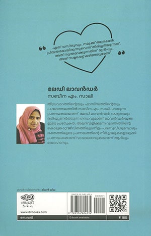 തീവ്രവാദത്തിന്റെയും ഫാസിസത്തിന്റെയും പശ്ചാത്തലത്തില് സബീന എം. സാലി പറയുന്ന പ്രണയകഥയാണ് ലേഡി ലാവന്ഡര്. വശ്യതയും രതിയുണര്ത്തുന്ന ഗന്ധവുമാണ് ലാവന്ഡര്പ്പൂക്കളുടെ പ്രത്യേകത. അലറിവിളിക്കുന്ന ദുരന്തത്തിന്റെ കൊടുങ്കാറ്റ് ജീവിതത്തിലുടനീളം പരന്നുവീശുമ്പോഴും രക്തത്തിലൂടെ പ്രണയത്തിന്റെ നീര്ച്ചാലുകളൊഴുക്കി പ്രണയംകൊണ്ട് വാചാലരാവുകയാണ് ആദിലും യൊഹാനും.