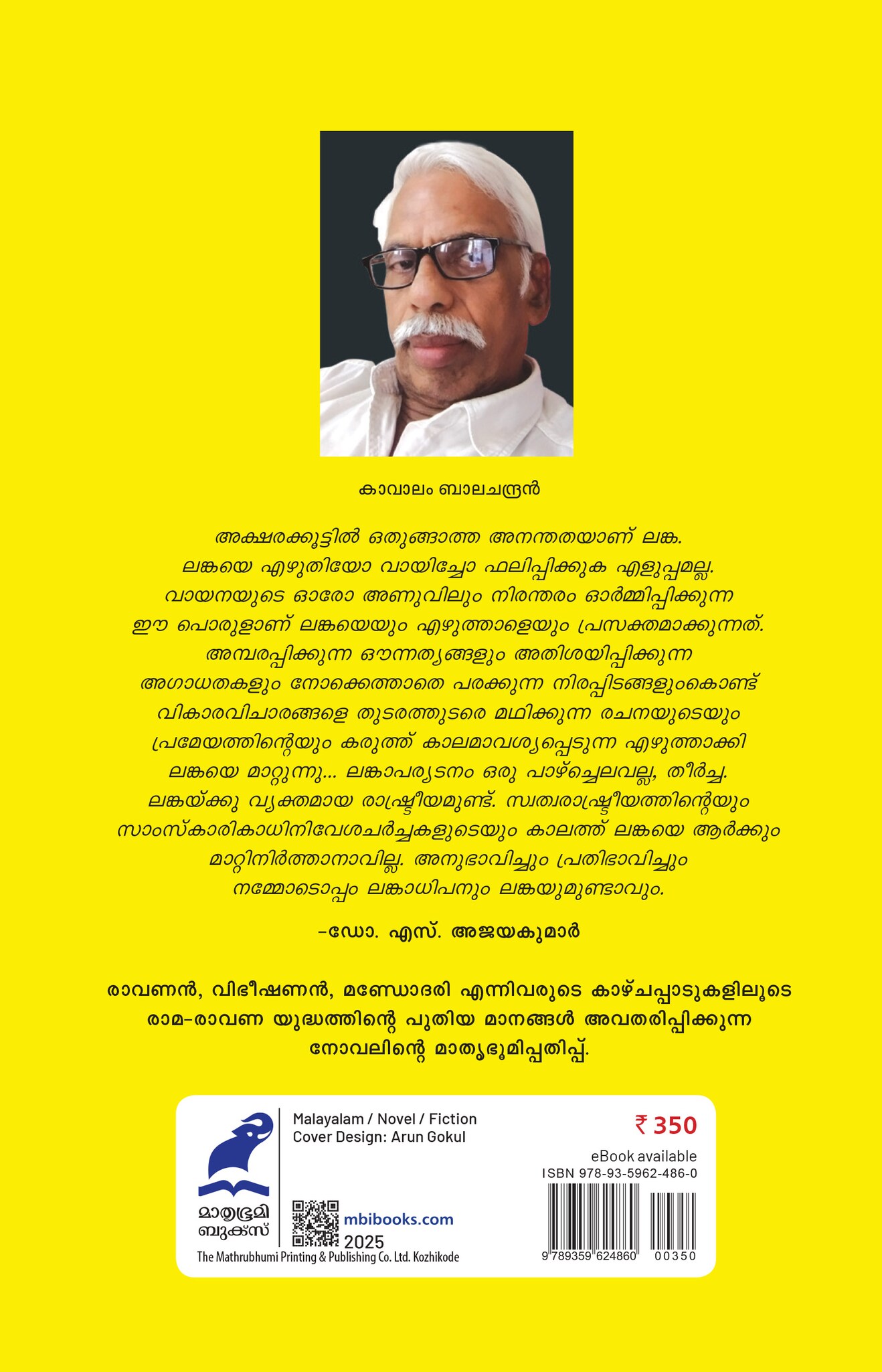 രാവണന്, വിഭീഷണന്, മണ്ഡോദരി എന്നിവരുടെ കാഴ്ചപ്പാടുകളിലൂടെ രാമ-രാവണ യുദ്ധത്തിന്റെ പുതിയ മാനങ്ങള് അവതരിപ്പിക്കുന്ന നോവലിന്റെ മാതൃഭൂമിപ്പതിപ്പ്.