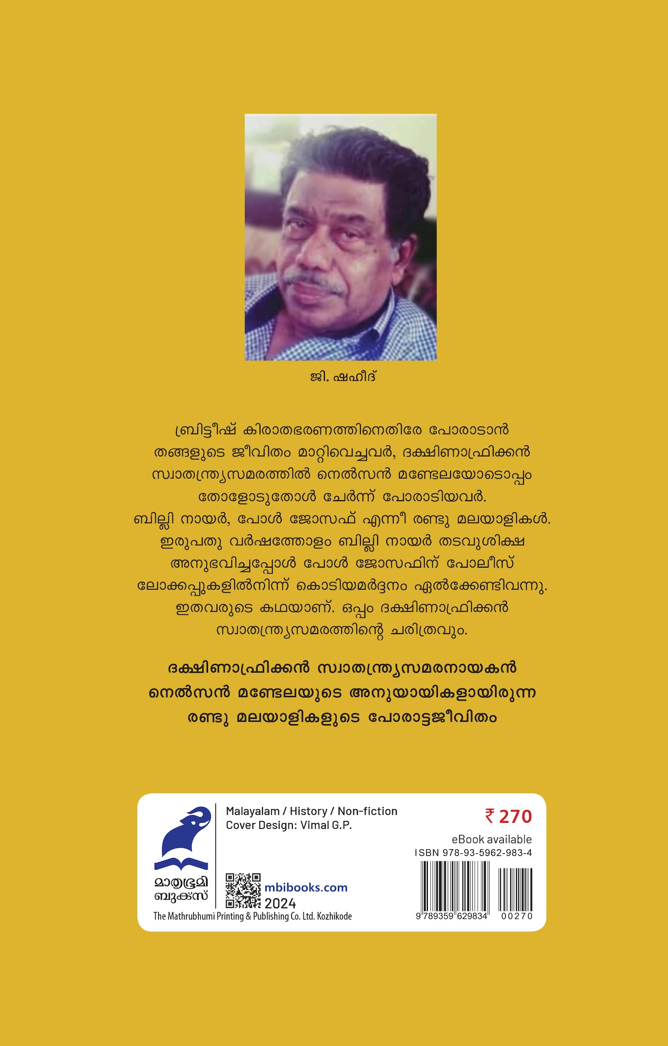 ബ്രിട്ടീഷ് കിരാതഭരണത്തിനെതിരേ പോരാടാന് തങ്ങളുടെ ജീവിതം മാറ്റിവെച്ചവര്, ദക്ഷിണാഫ്രിക്കന് സ്വാതന്ത്ര്യസമരത്തില് നെല്സന് മണ്ടേലയോടൊപ്പം തോളോടുതോള് ചേര്ന്ന് പോരാടിയവര്. ബില്ലി നായര്, പോള് ജോസഫ് എന്നീ രണ്ടു മലയാളികള്. ഇരുപതു വര്ഷത്തോളം ബില്ലി നായര് തടവുശിക്ഷ അനുഭവിച്ചപ്പോള് പോള് ജോസഫിന് പോലീസ് ലോക്കപ്പുകളില്നിന്ന് കൊടിയമര്ദ്ദനം ഏല്ക്കേണ്ടിവന്നു. ഇതവരുടെ കഥയാണ്. ഒപ്പം ദക്ഷിണാഫ്രിക്കന് സ്വാതന്ത്ര്യസമരത്തിന്റെ ചരിത്രവും.