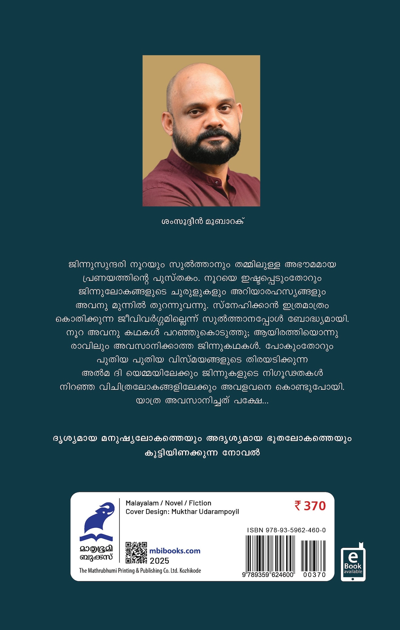 ജിന്നുസുന്ദരി നൂറയും സുല്ത്താനും തമ്മിലുള്ള അഭൗമമായ പ്രണയത്തിന്റെ പുസ്തകം. നൂറയെ ഇഷ്ടപ്പെടുംതോറും ജിന്നുലോകങ്ങളുടെ ചുരുളുകളും അറിയാരഹസ്യങ്ങളും അവനു മുന്നില് തുറന്നുവന്നു. സ്നേഹിക്കാന് ഇത്രമാത്രം കൊതിക്കുന്ന ജീവിവര്ഗ്ഗമില്ലെന്ന് സുല്ത്താനപ്പോള് ബോദ്ധ്യമായി. നൂറ അവനു കഥകള് പറഞ്ഞുകൊടുത്തു; ആയിരത്തിയൊന്നു രാവിലും അവസാനിക്കാത്ത ജിന്നുകഥകള്. പോകുംതോറും പുതിയ പുതിയ വിസ്മയങ്ങളുടെ തിരയടിക്കുന്ന അല്മ ദി യെമ്മയിലേക്കും ജിന്നുകളുടെ നിഗൂഢതകള് നിറഞ്ഞ വിചിത്രലോകങ്ങളിലേക്കും അവളവനെ കൊണ്ടുപോയി. യാത്ര അവസാനിച്ചത് പക്ഷേ…