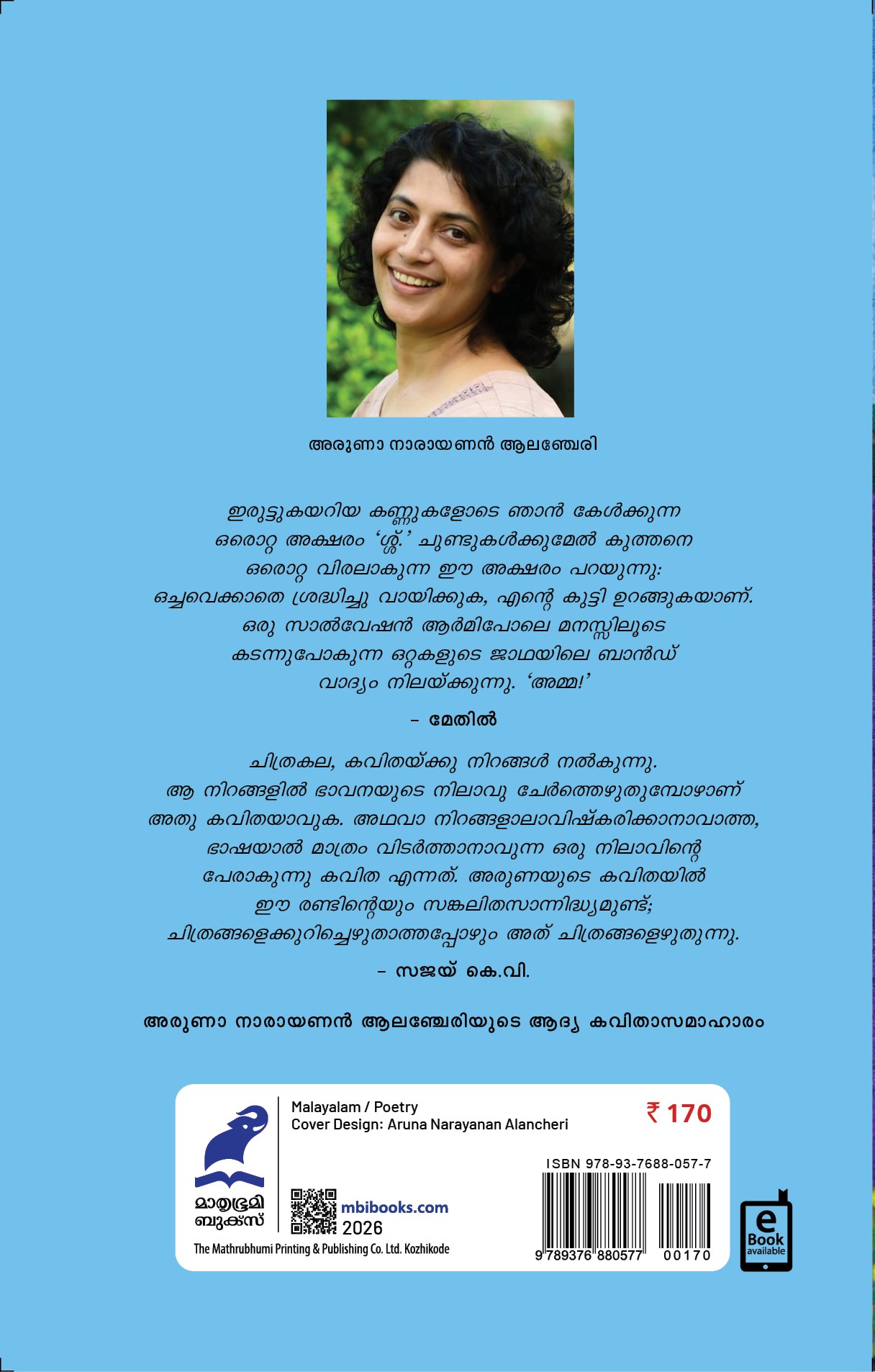 ചിത്രകല, കവിതയ്ക്കു നിറങ്ങള് നല്കുന്നു. ആ നിറങ്ങളില് ഭാവനയുടെ നിലാവു ചേര്ത്തെഴുതുമ്പോഴാണ് അതു കവിതയാവുക. അഥവാ നിറങ്ങളാലാവിഷ്കരിക്കാനാവാത്ത, ഭാഷയാല് മാത്രം വിടര്ത്താനാവുന്ന ഒരു നിലാവിന്റെ പേരാകുന്നു കവിത എന്നത്. അരുണയുടെ കവിതയില് ഈ രണ്ടിന്റെയും സങ്കലിതസാന്നിദ്ധ്യമുണ്ട്; ചിത്രങ്ങളെക്കുറിച്ചെഴുതാത്തപ്പോഴും അത് ചിത്രങ്ങളെഴുതുന്നു.