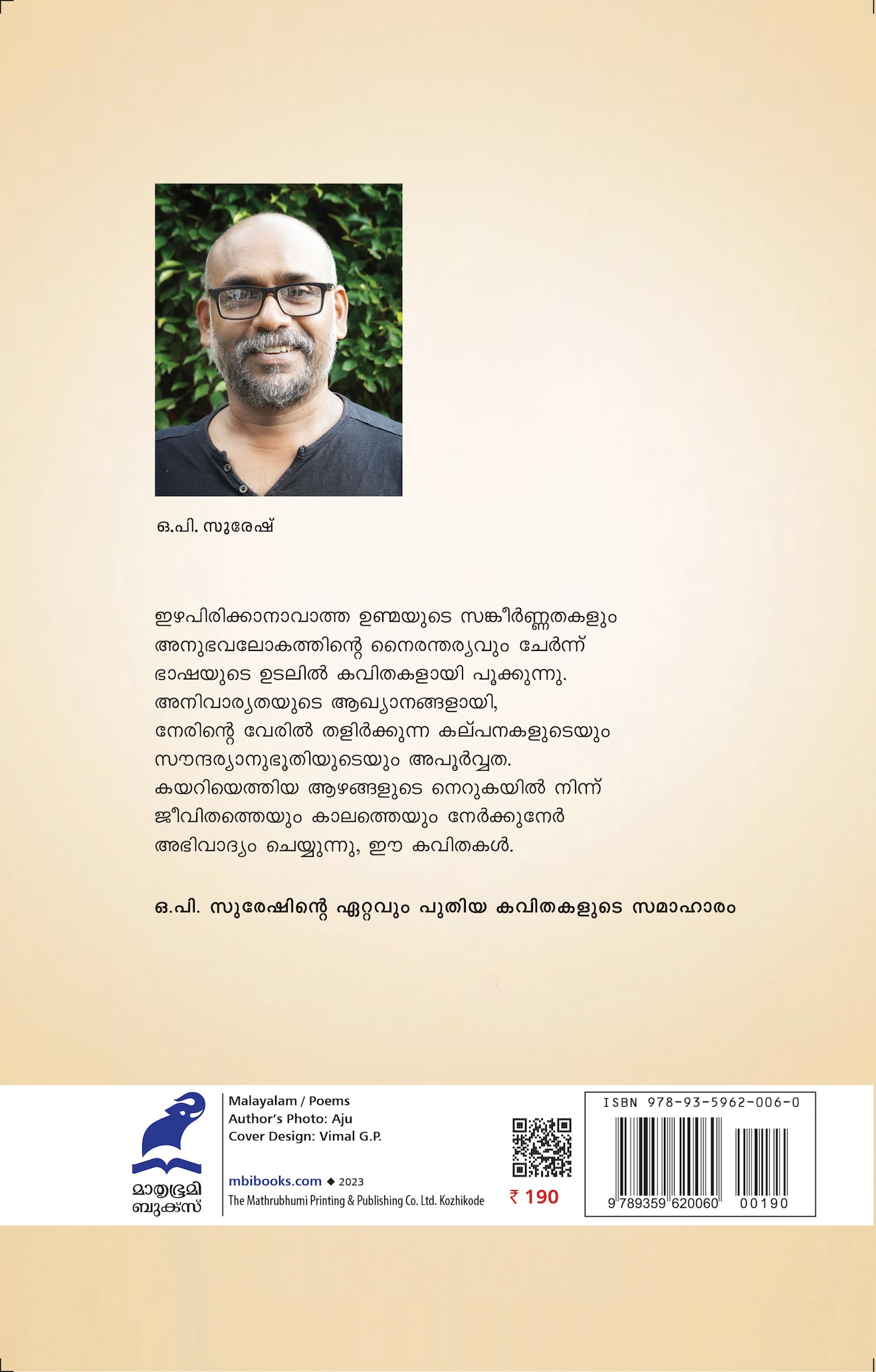 ഇഴപിരിക്കാനാവാത്ത ഉണ്മയുടെ സങ്കീര്ണ്ണതകളും അനുഭവലോകത്തിന്റെ നൈരന്തര്യവും ചേര്ന്ന് ഭാഷയുടെ ഉടലില് കവിതകളായി പൂക്കുന്നു. അനിവാര്യതയുടെ ആഖ്യാനങ്ങളായി, നേരിന്റെ വേരില് തളിര്ക്കുന്ന കല്പനകളുടെയും സൗന്ദര്യാനുഭൂതിയുടെയും അപൂര്വ്വത. കയറിയെത്തിയ ആഴങ്ങളുടെ നെറുകയില് നിന്ന് ജീവിതത്തെയും കാലത്തെയും നേര്ക്കുനേര്