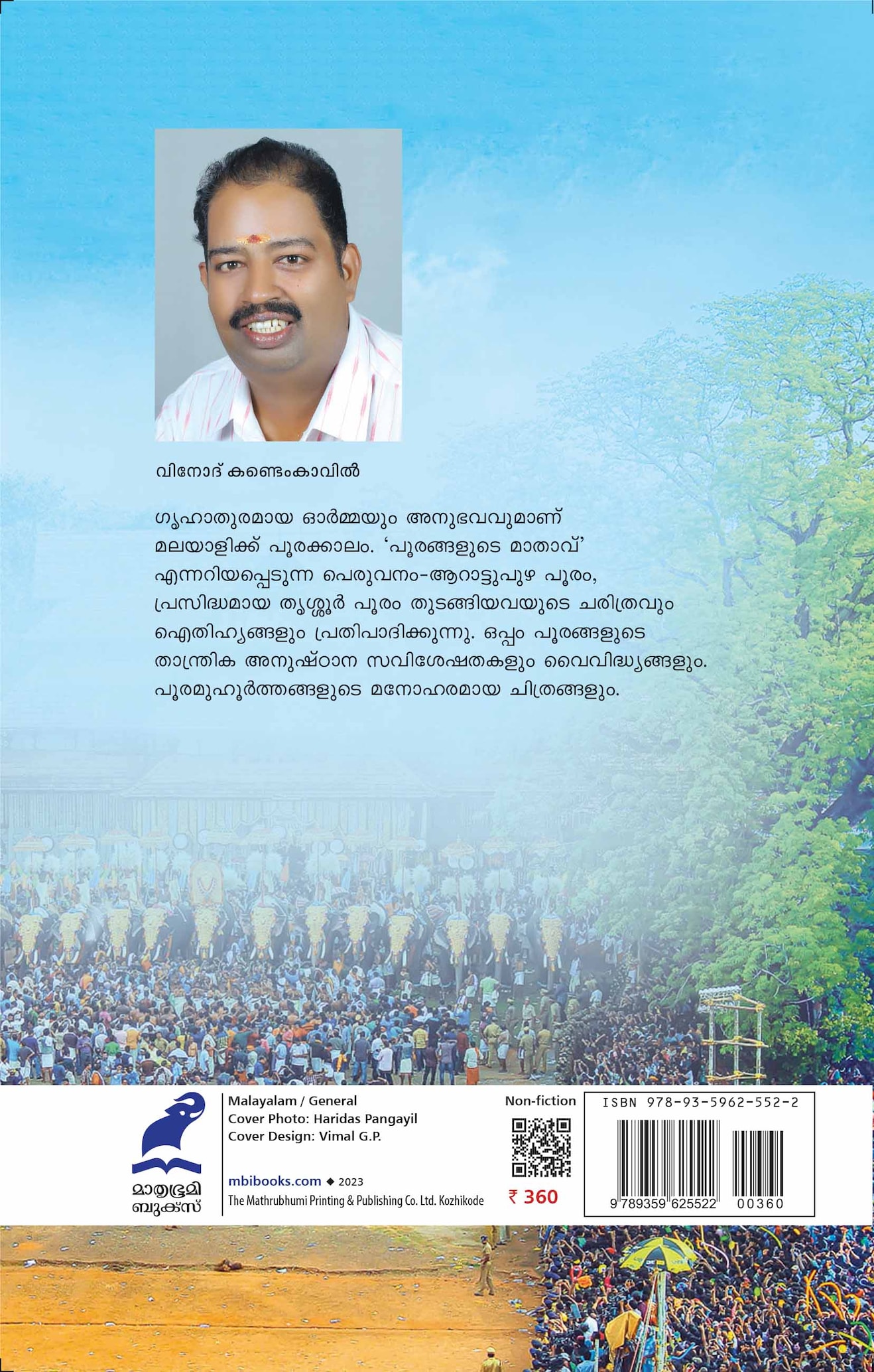 ഗൃഹാതുരമായ ഓര്മ്മയും അനുഭവവുമാണ് മലയാളിക്ക് പൂരക്കാലം. ‘പൂരങ്ങളുടെ മാതാവ്’ എന്നറിയപ്പെടുന്ന പെരുവനം-ആറാട്ടുപുഴ പൂരം, പ്രസിദ്ധമായ തൃശ്ശൂര് പൂരം തുടങ്ങിയവയുടെ ചരിത്രവും ഐതിഹ്യങ്ങളും പ്രതിപാദിക്കുന്നു. ഒപ്പം പൂരങ്ങളുടെ താന്ത്രിക അനുഷ്ഠാന സവിശേഷതകളും വൈവിദ്ധ്യങ്ങളും. പൂരമുഹൂര്ത്തങ്ങളുടെ മനോഹരമായ ചിത്രങ്ങളും.