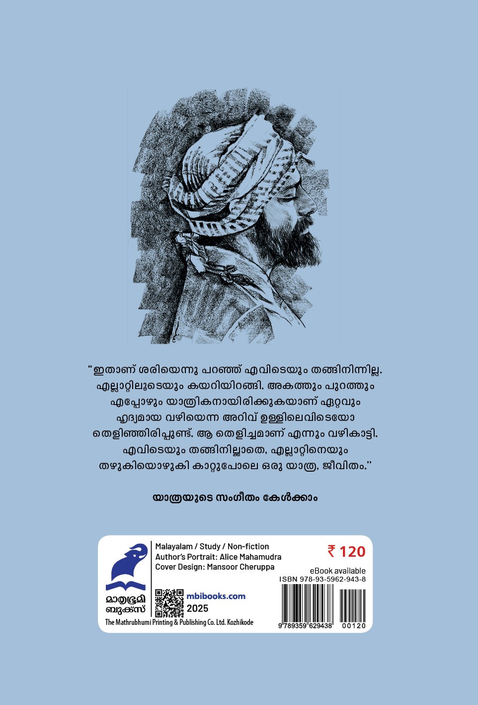 ‘ഇതാണ് ശരിയെന്നു പറഞ്ഞ് എവിടെയും തങ്ങിനിന്നില്ല. എല്ലാറ്റിലൂടെയും കയറിയിറങ്ങി. അകത്തും പുറത്തും എപ്പോഴും യാത്രികനായിരിക്കുകയാണ് ഏറ്റവും ഹൃദ്യമായ വഴിയെന്ന അറിവ് ഉള്ളിലെവിടെയോ തെളിഞ്ഞിരിപ്പുണ്ട്. ആ തെളിച്ചമാണ് എന്നും വഴികാട്ടി. എവിടെയും തങ്ങിനില്ക്കാതെ, എല്ലാറ്റിനെയും തഴുകിയൊഴുകി കാറ്റുപോലെ ഒരു യാത്ര, ജീവിതം.”